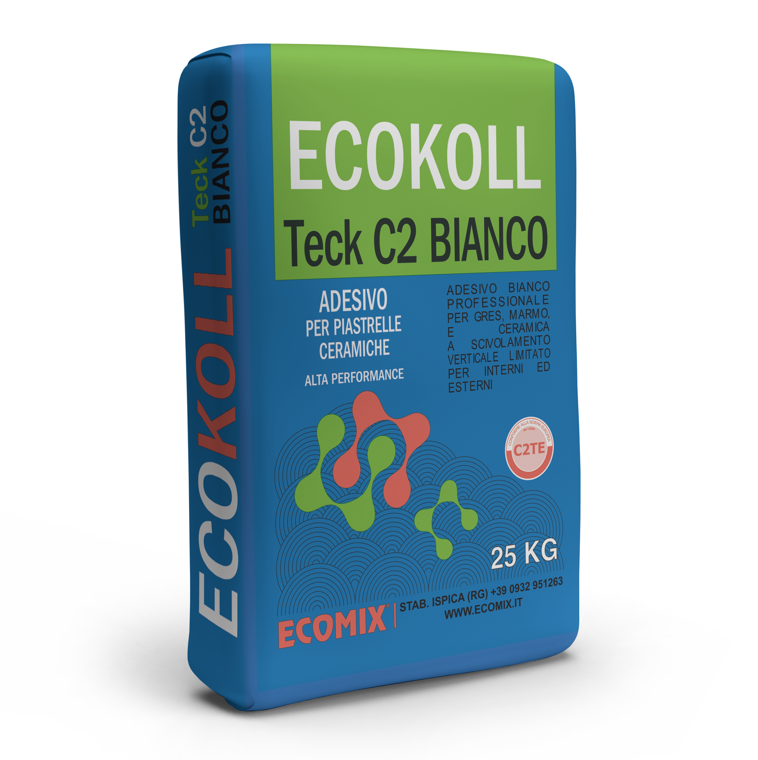 ECOKOLL TECK bianco è un adesivo cementizio a base di leganti ad alta resistenza, inerti selezionati, resine sintetiche con l’aggiunta di specifici additivi per migliorarne la lavorabilità e le prestazioni. Adesivo altamente performante, costituito da cemento portland ad alta resistenza, da uno specifico mix di resine composte da co-polimeri acrilici, dispersi in polvere, che migliorano l’adesione tra sottofondo e adesivo e additivo ritentore idrico, composto da etere di cellulosa altamente modificata, che migliora le prestazioni in termini di prolungamento del tempo aperto, elevata resistenza allo scivolamento, tissotropia e resistenza termica. I componenti vengono attivati al contatto con l’acqua d’impasto creando un intimo legame tra l’adesivo, il sottofondo e i rivestimenti. La curva granulometrica opportunamente studiata per facilitare ed esaltare la lavorabilità e per consentire un ottimo livello di traspirabilità al prodotto indurito. Tali caratteristiche lo rendono particolarmente adatto, in funzione dei diversi requisiti progettuali per la posa all’esterno e all’interno di qualsiasi tipologia di pavimentazione, anche soggetta a traffico intenso. Il formato massimo delle piastrelle deve essere di 45 cm (lato maggiore), per piastrelle di dimensioni maggiori, si consiglia l’uso di ECOKOLL FLEX ed ECOKOLL SPECIAL.